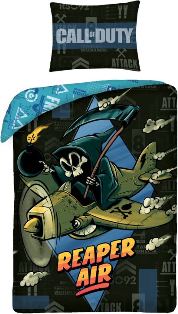 Call of Duty Dekbedovertrek, Reaper. Ben jij degene die alle cyborgs als eerst hebt uitgeschakeld in het spel Call of Duty? Dan is dit het dekbedovertrek voor jou! Het overtrek is voorzien van een cartoon afbeelding van een Air Reaper, is dubbelzijdig bedrukt en wordt geleverd met een extra groot kussensloop. Een echte blikvanger voor een stoere slaapkamer. De set wordt geleverd in een bijpassend katoenen tasje, wat het een leuk cadeau maakt om te geven én te krijgen!