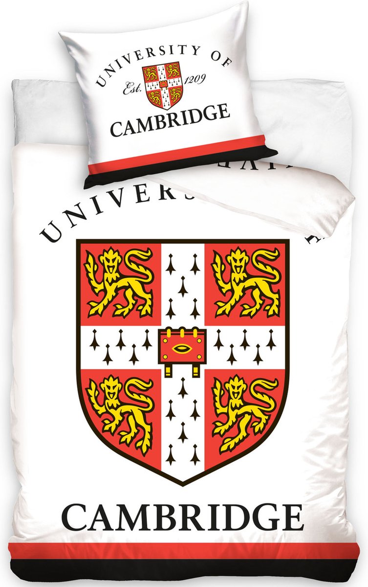 Cambridge Dekbedovertrek. Is je grootse wens om ooit aan de universiteit van Cambridge te kunnen studeren? Dan kan je nu vast beginnen met dit dekbedovertrek. Het katoenen overtrek bevat het logo van deze prestigieuze Engelse Universiteit, op een witte achtergrond. Door het extra grote kussensloop heb je een geweldige blikvanger te pakken! Een fantastisch cadeau idee voor een echte studiebol of voor een liefhebber van deze Engelse school.