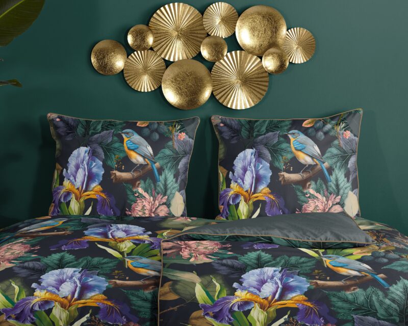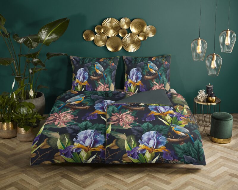 Satijnen dekbedovertrek “Dilana” van Descanso. Dit stijlvolle dekbedovertrek met bloemen en vogels, in de kleur “Antraciet” is gemaakt van 100% katoen-satijn. Descanso dekbedovertrekken zijn luxueus, stijlvol en elegant! Aan de achterkant van een Descanso dekbedovertrek zit altijd een mooie, bijpassende uni kleur. Dekbedovertrekken en kussenslopen van Descanso zijn rondom voorzien van een luxe bies/ piping in een bijpassende kleur. Een Descanso dekbedovertrek geeft een luxe uitstraling aan uw slaapkamer!