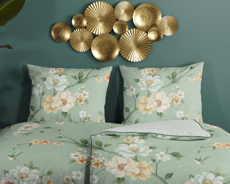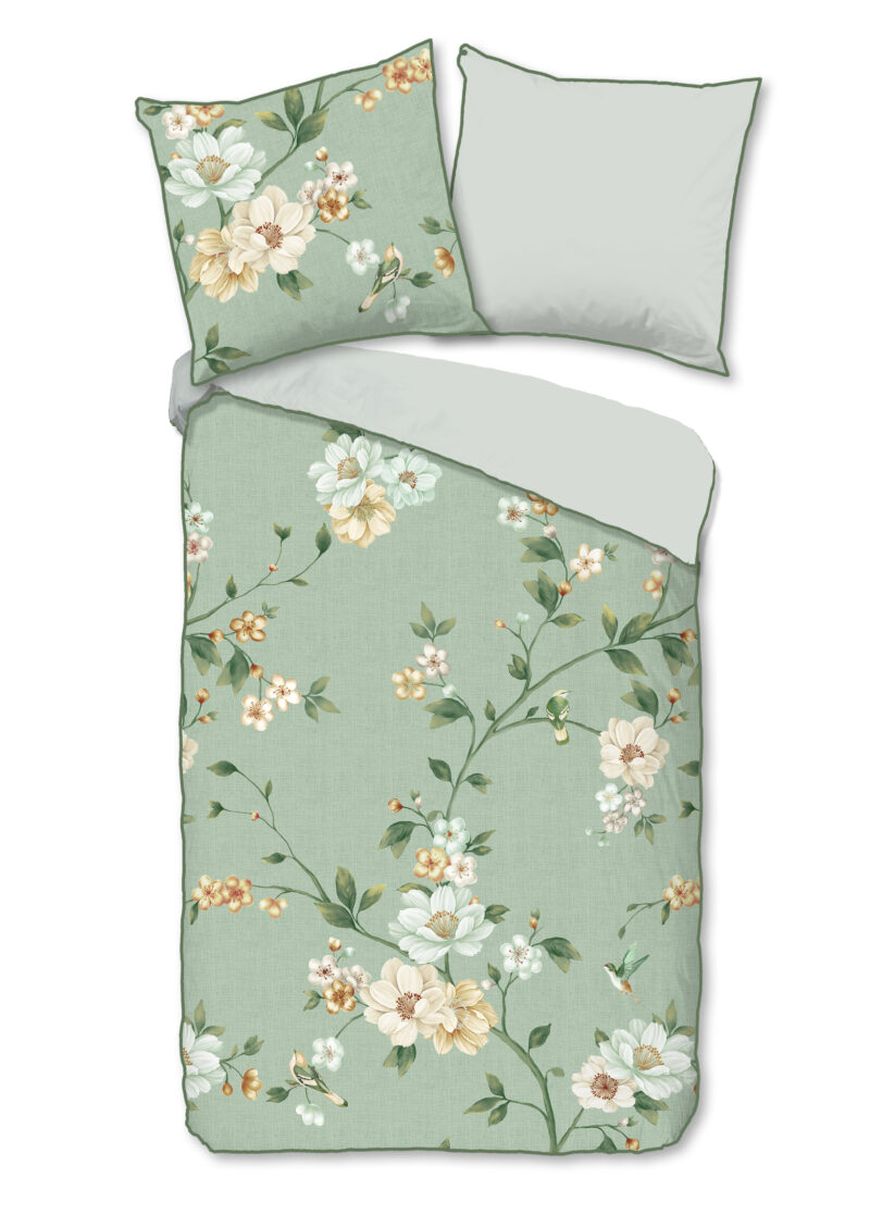 Satijnen dekbedovertrek “Sizena” van Descanso. Dit stijlvolle dekbedovertrek met bloemen, in de kleur “Groen” is gemaakt van 100% katoen-satijn. Descanso dekbedovertrekken zijn luxueus, stijlvol en elegant! Aan de achterkant van een Descanso dekbedovertrek zit altijd een mooie, bijpassende uni kleur. Dekbedovertrekken en kussenslopen van Descanso zijn rondom voorzien van een luxe bies/ piping in een bijpassende kleur. Een Descanso dekbedovertrek geeft een luxe uitstraling aan uw slaapkamer!