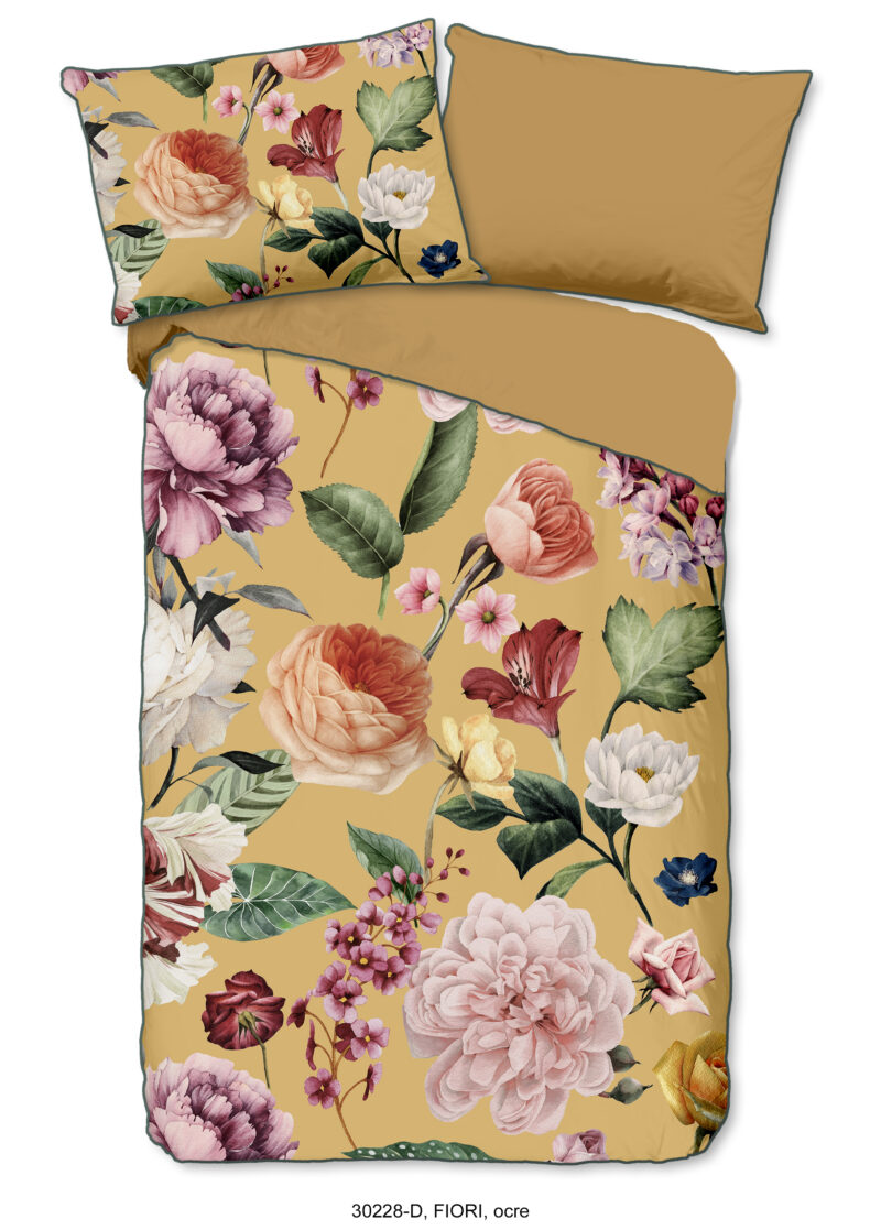 Satijnen dekbedovertrek “Fiori” van Descanso. Dit stijlvolle dekbedovertrek met bloemen, in de kleur “Oker” is gemaakt van 100% katoen-satijn. Descanso dekbedovertrekken zijn luxueus, stijlvol en elegant! Aan de achterkant van een Descanso dekbedovertrek zit altijd een mooie, bijpassende uni kleur. Dekbedovertrekken en kussenslopen van Descanso zijn rondom voorzien van een luxe bies/ piping in een bijpassende kleur. Een Descanso dekbedovertrek geeft een luxe uitstraling aan uw slaapkamer!