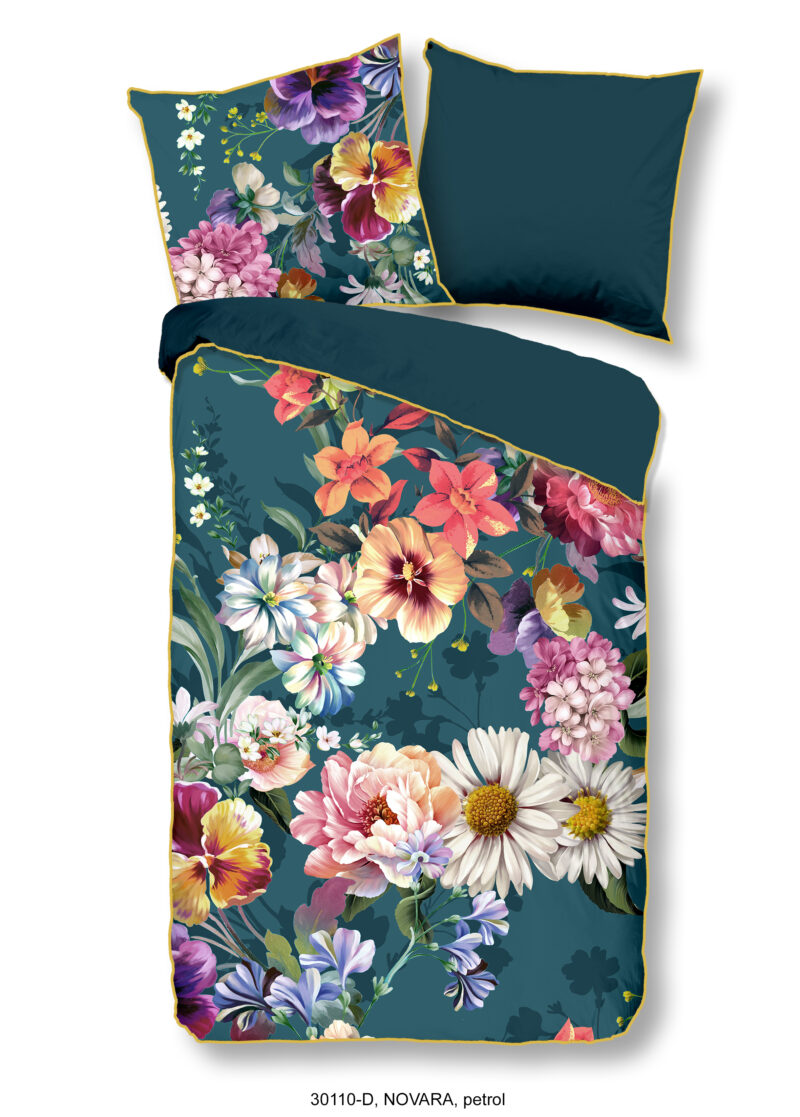 Satijnen dekbedovertrek “Novara” van Descanso. Dit stijlvolle dekbedovertrek met bloemen, in de kleur “Petrol” is gemaakt van 100% katoen-satijn. Descanso dekbedovertrekken zijn luxueus, stijlvol en elegant! Aan de achterkant van een Descanso dekbedovertrek zit altijd een mooie, bijpassende uni kleur. Dekbedovertrekken en kussenslopen van Descanso zijn rondom voorzien van een luxe bies/ piping in een bijpassende kleur. Een Descanso dekbedovertrek geeft een luxe uitstraling aan uw slaapkamer!