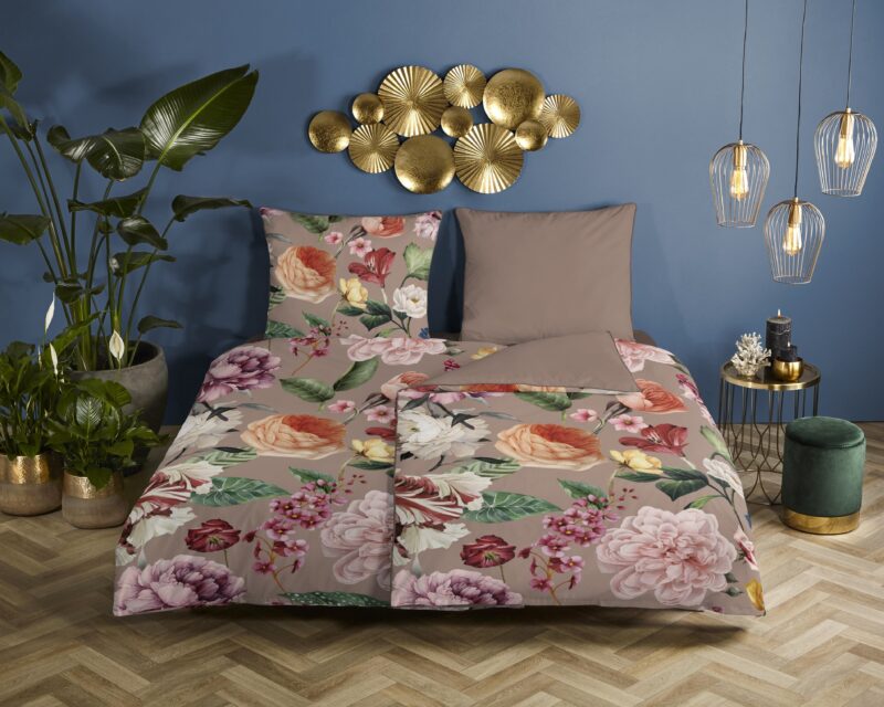 Descanso Dekbedovertrek “bloemen” – Taupe – (135×200 cm) – Biologisch Katoen satijn