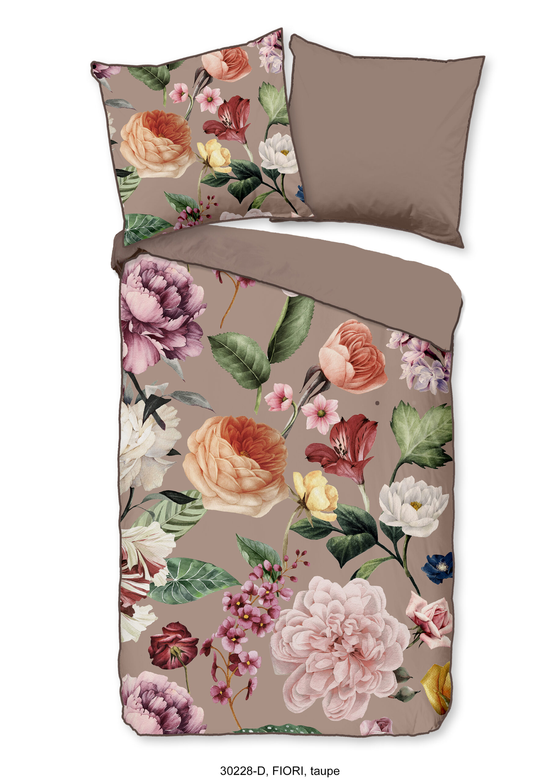 Satijnen dekbedovertrek “Fiori” van Descanso. Dit stijlvolle dekbedovertrek met bloemen, in de kleur “Taupe” is gemaakt van 100% katoen-satijn. Descanso dekbedovertrekken zijn luxueus, stijlvol en elegant! Aan de achterkant van een Descanso dekbedovertrek zit altijd een mooie, bijpassende uni kleur. Dekbedovertrekken en kussenslopen van Descanso zijn rondom voorzien van een luxe bies/ piping in een bijpassende kleur. Een Descanso dekbedovertrek geeft een luxe uitstraling aan uw slaapkamer!