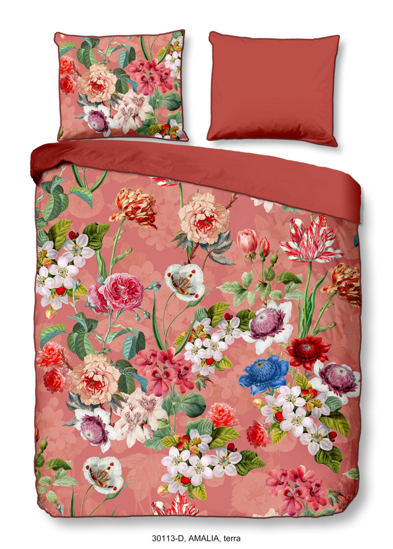 Satijnen dekbedovertrek “Amalia” van Descanso. Dit stijlvolle dekbedovertrek met bloemen, in de kleur “Terra” is gemaakt van 100% katoen-satijn. Descanso dekbedovertrekken zijn luxueus, stijlvol en elegant! Aan de achterkant van een Descanso dekbedovertrek zit altijd een mooie, bijpassende uni kleur. Dekbedovertrekken en kussenslopen van Descanso zijn rondom voorzien van een luxe bies/ piping in een bijpassende kleur. Een Descanso dekbedovertrek geeft een luxe uitstraling aan uw slaapkamer!