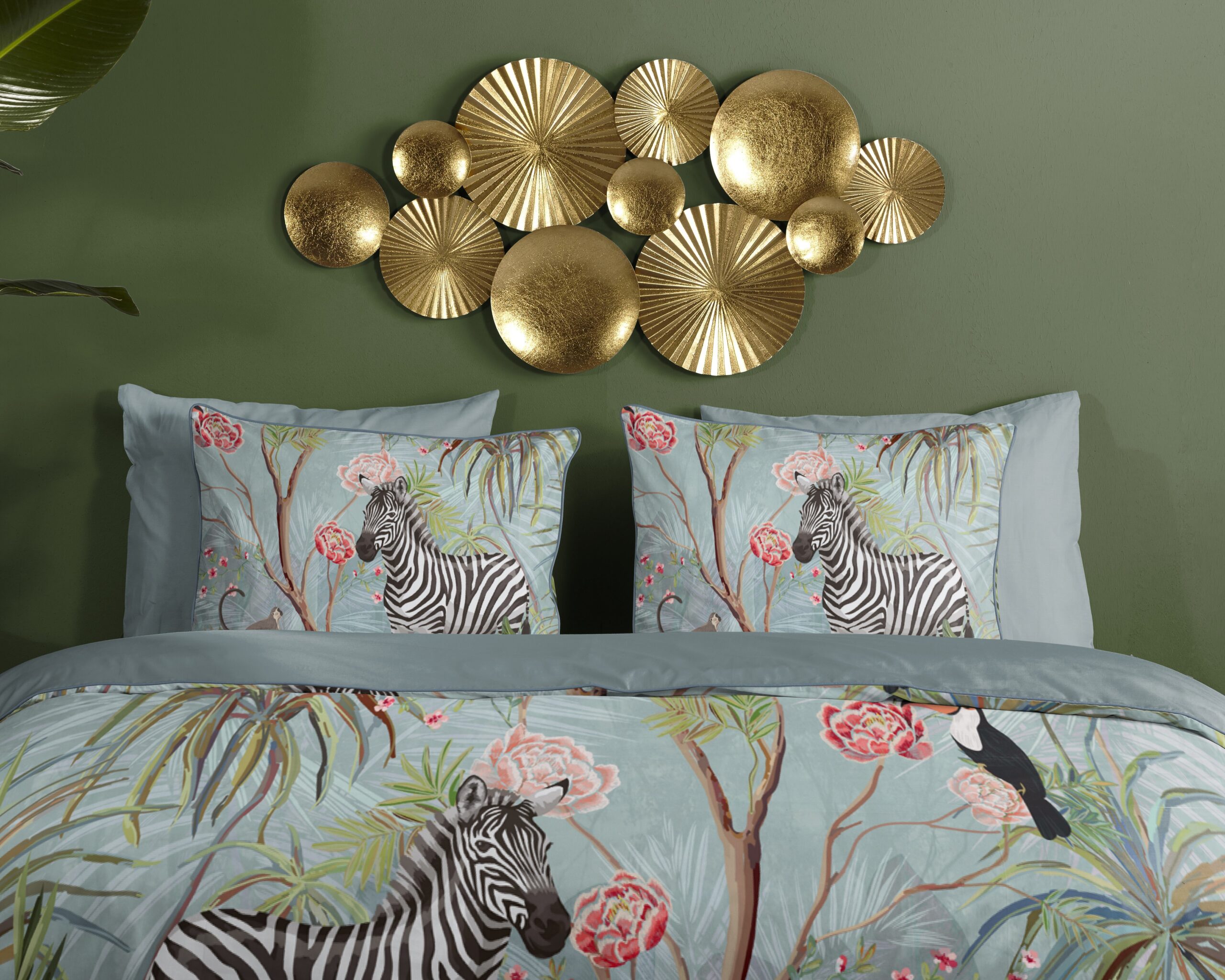 Satijnen dekbedovertrek “Yasmin” van Descanso. Dit stijlvolle dekbedovertrek met jungle print, in de kleur “Aqua” is gemaakt van 100% katoen-satijn. Descanso dekbedovertrekken zijn luxueus, stijlvol en elegant! Aan de achterkant van een Descanso dekbedovertrek zit altijd een mooie, bijpassende uni kleur. Dekbedovertrekken en kussenslopen van Descanso zijn rondom voorzien van een luxe bies/ piping in een bijpassende kleur. Een Descanso dekbedovertrek geeft een luxe uitstraling aan uw slaapkamer!