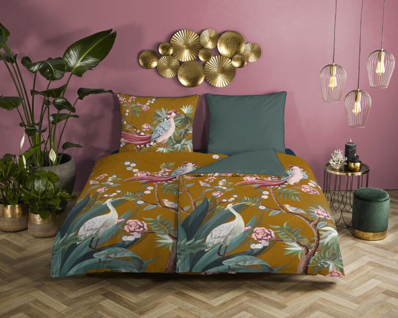 Satijnen dekbedovertrek “Sarenza” van Descanso. Dit stijlvolle dekbedovertrek met kraanvogel met bloemen, in de kleur “Oker” is gemaakt van 100% katoen-satijn. Descanso dekbedovertrekken zijn luxueus, stijlvol en elegant! Aan de achterkant van een Descanso dekbedovertrek zit altijd een mooie, bijpassende uni kleur. Dekbedovertrekken en kussenslopen van Descanso zijn rondom voorzien van een luxe bies/ piping in een bijpassende kleur. Een Descanso dekbedovertrek geeft een luxe uitstraling aan uw slaapkamer!