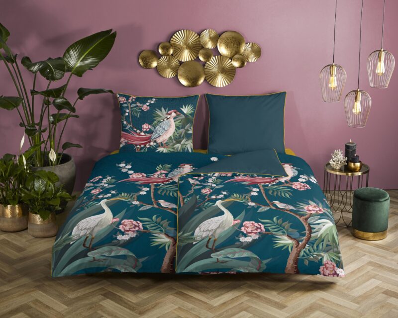 Descanso Dekbedovertrek “kraanvogel met bloemen” – Petrol – (135×200 cm) – Biologisch Katoen satijn