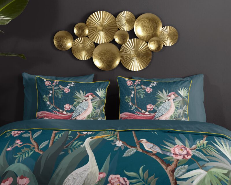 Descanso Dekbedovertrek “kraanvogel met bloemen” – Petrol – (140×200/220 cm) – Biologisch Katoen satijn