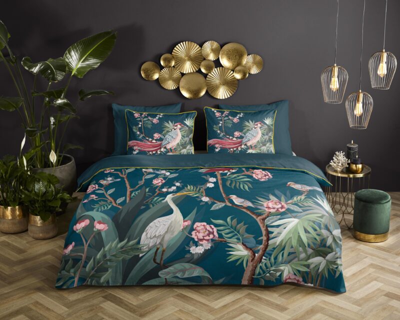 Descanso Dekbedovertrek “kraanvogel met bloemen” – Petrol – (200×200/220 cm) – Biologisch Katoen satijn