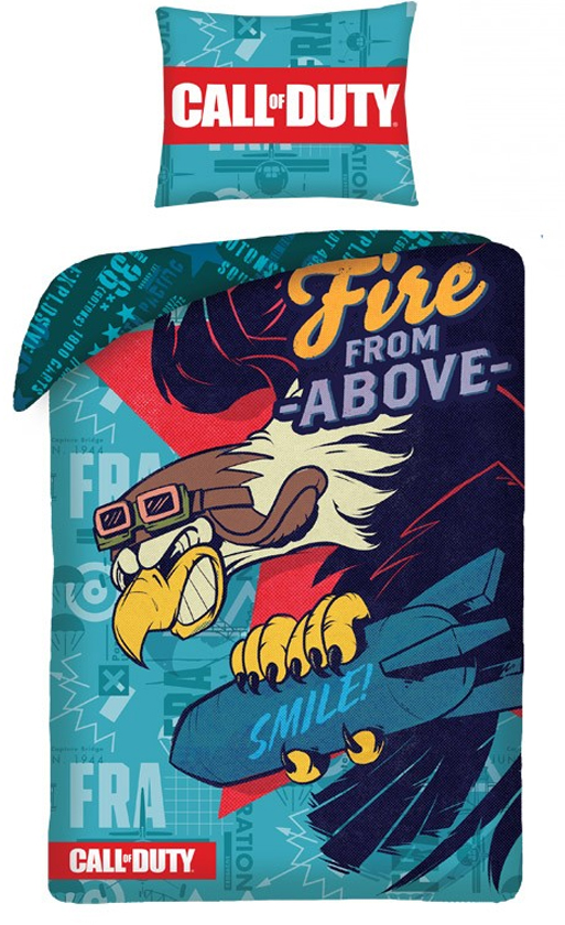 Call of Duty Dekbedovertrek, Fire. Ben jij degene die alle cyborgs als eerst hebt uitgeschakeld in het spel Call of Duty? Dan is dit het dekbedovertrek voor jou! Het overtrek is voorzien van een cartoon afbeelding van een Adelaar, is dubbelzijdig bedrukt en wordt geleverd met een extra groot kussensloop. Een echte blikvanger voor een stoere slaapkamer. De set wordt geleverd in een bijpassend katoenen tasje, wat het een leuk cadeau maakt om te geven én te krijgen!