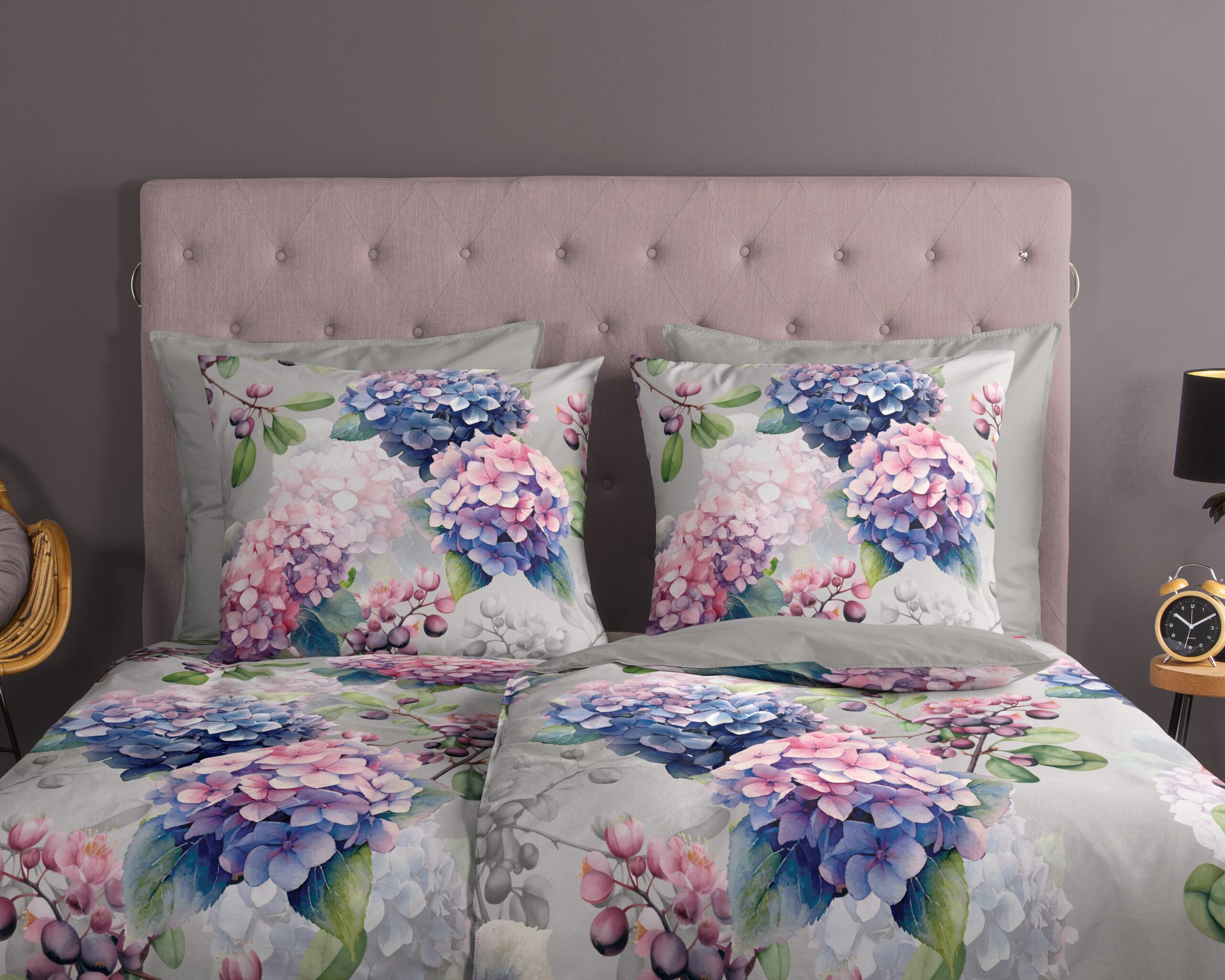 Dekbedovertrek “Julia” van Good Morning met hortensia bloemen, in de kleur “Grijs” is gemaakt van 100% katoen. Deze kwaliteit is ademend, vochtabsorberend en voelt zacht en soepel aan. Dit mooie dekbedovertrek fleurt iedere slaapkamer op en is geschikt voor ieder jaargetijde. Het katoenen dekbedovertrek is heerlijk koel in de zomer en geeft warmte in de winter.