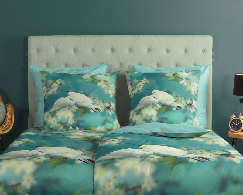 Dekbedovertrek “Loving” van Good Morning met witte duiven, in de kleur “Aqua” is gemaakt van 100% katoen. Deze kwaliteit is ademend, vochtabsorberend en voelt zacht en soepel aan. Dit mooie dekbedovertrek fleurt iedere slaapkamer op en is geschikt voor ieder jaargetijde. Het katoenen dekbedovertrek is heerlijk koel in de zomer en geeft warmte in de winter.