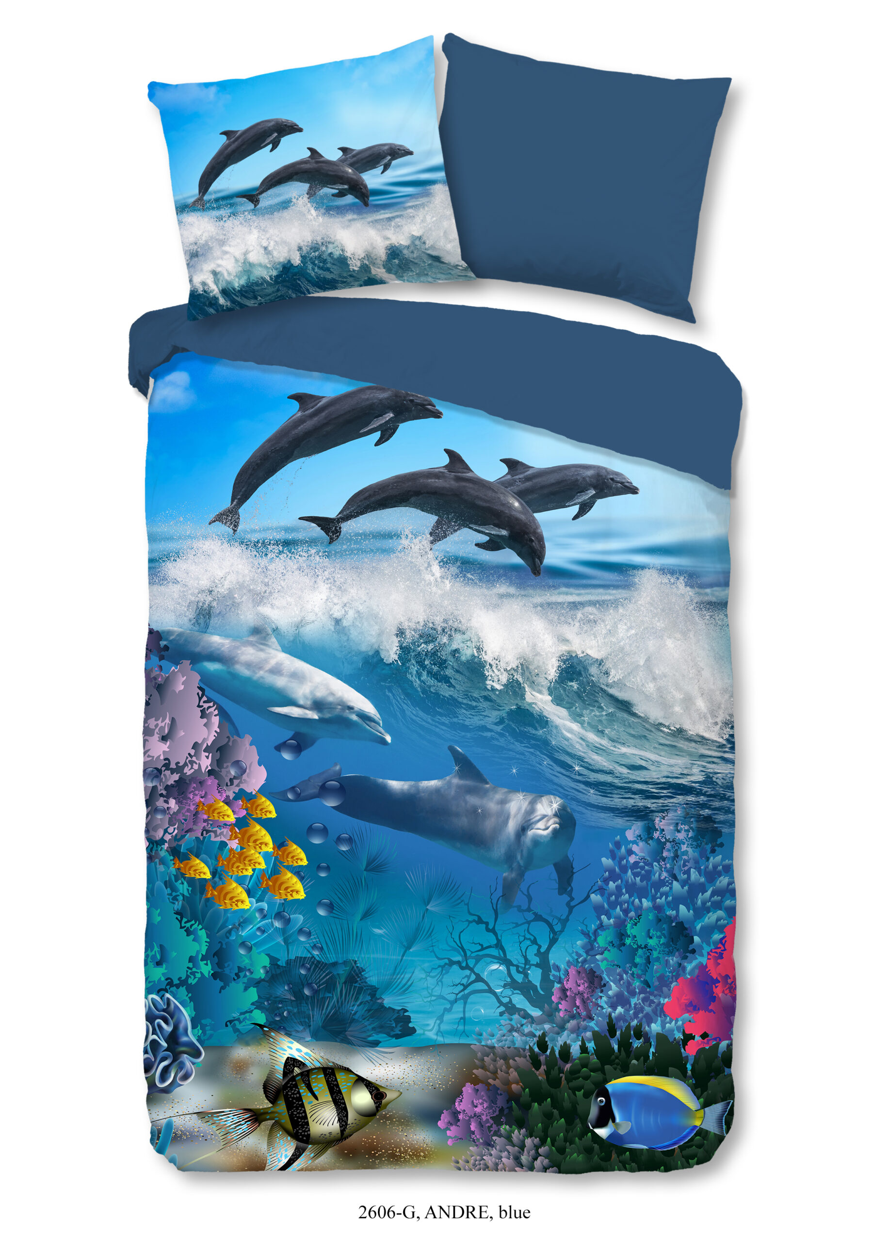 Kinderdekbedovertrek “Andre” van Good Morning met dolfijnen, in de kleur “Blauw” is gemaakt van 100% katoen. Deze kwaliteit is ademend, vochtabsorberend en voelt zacht en soepel aan. Dit leuke kinderdekbedovertrek is een toevoeging aan iedere kinderkamer en is geschikt voor ieder jaargetijde. Het katoenen dekbedovertrek is heerlijk koel in de zomer en geeft warmte in de winter.