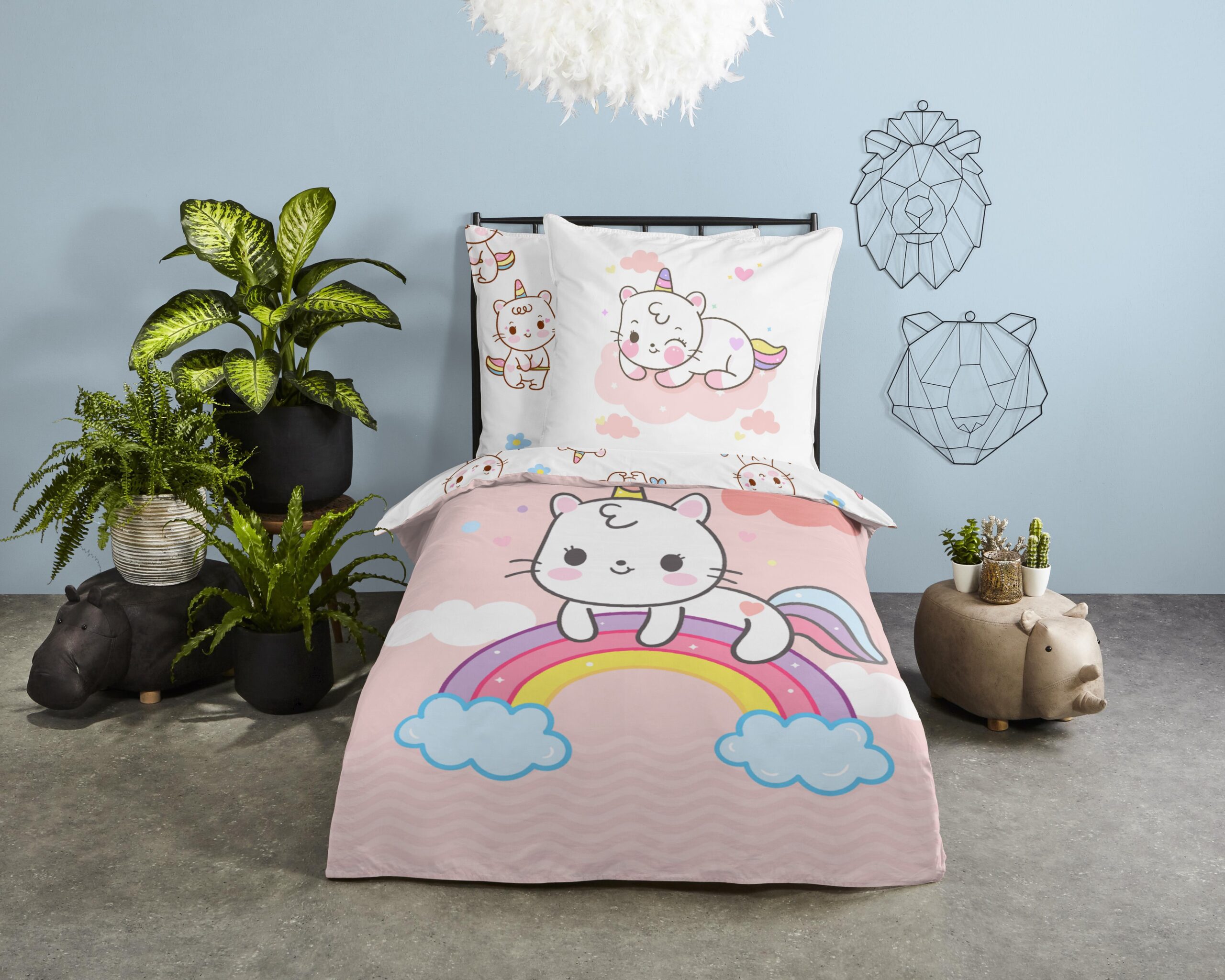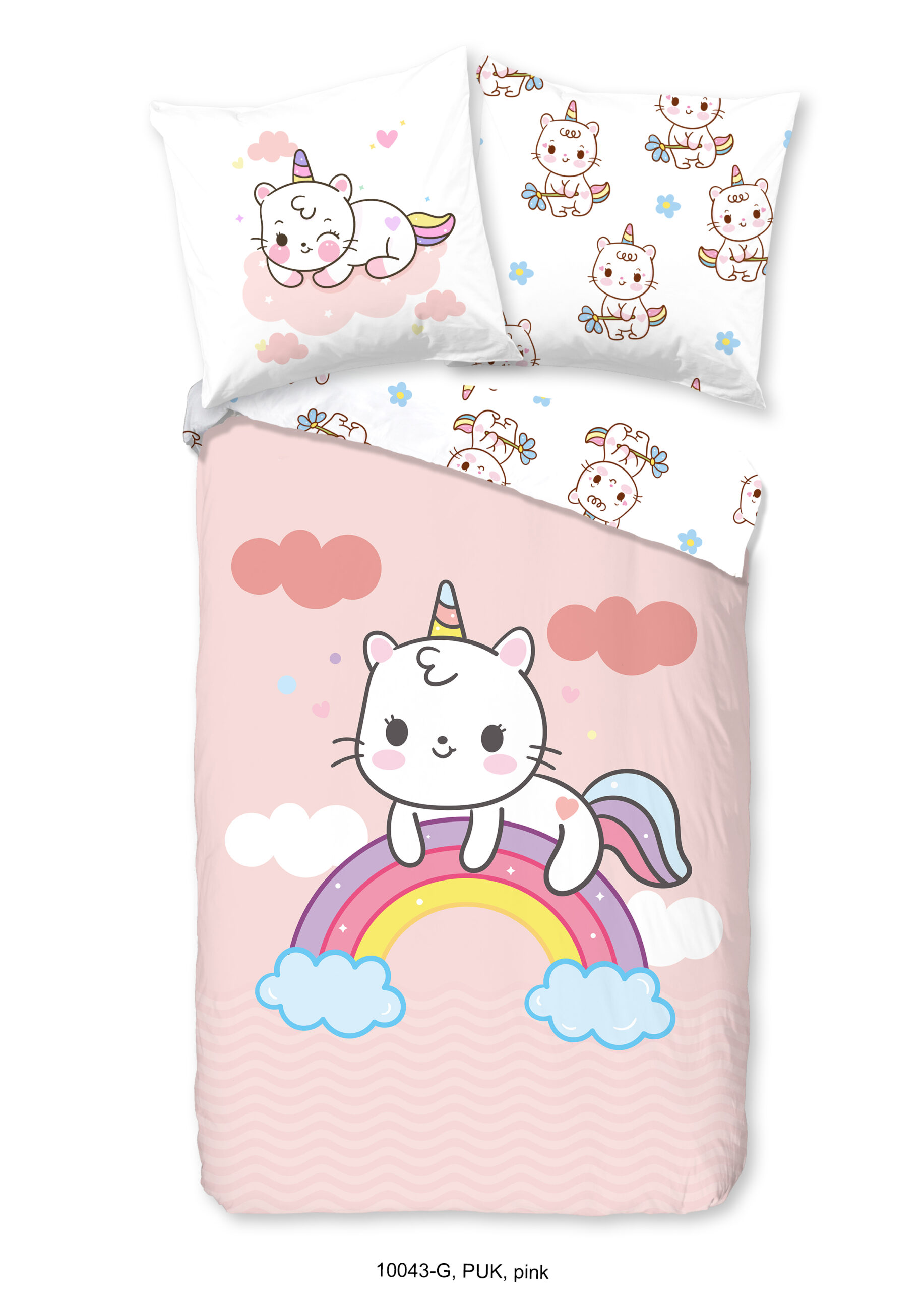 Kinderdekbedovertrek “Puk” van Good Morning met eenhoorn kat met regenboog, in de kleur “Roze” is gemaakt van 100% katoen. Deze kwaliteit is ademend, vochtabsorberend en voelt zacht en soepel aan. Dit leuke kinderdekbedovertrek is een toevoeging aan iedere kinderkamer en is geschikt voor ieder jaargetijde. Het katoenen dekbedovertrek is heerlijk koel in de zomer en geeft warmte in de winter.