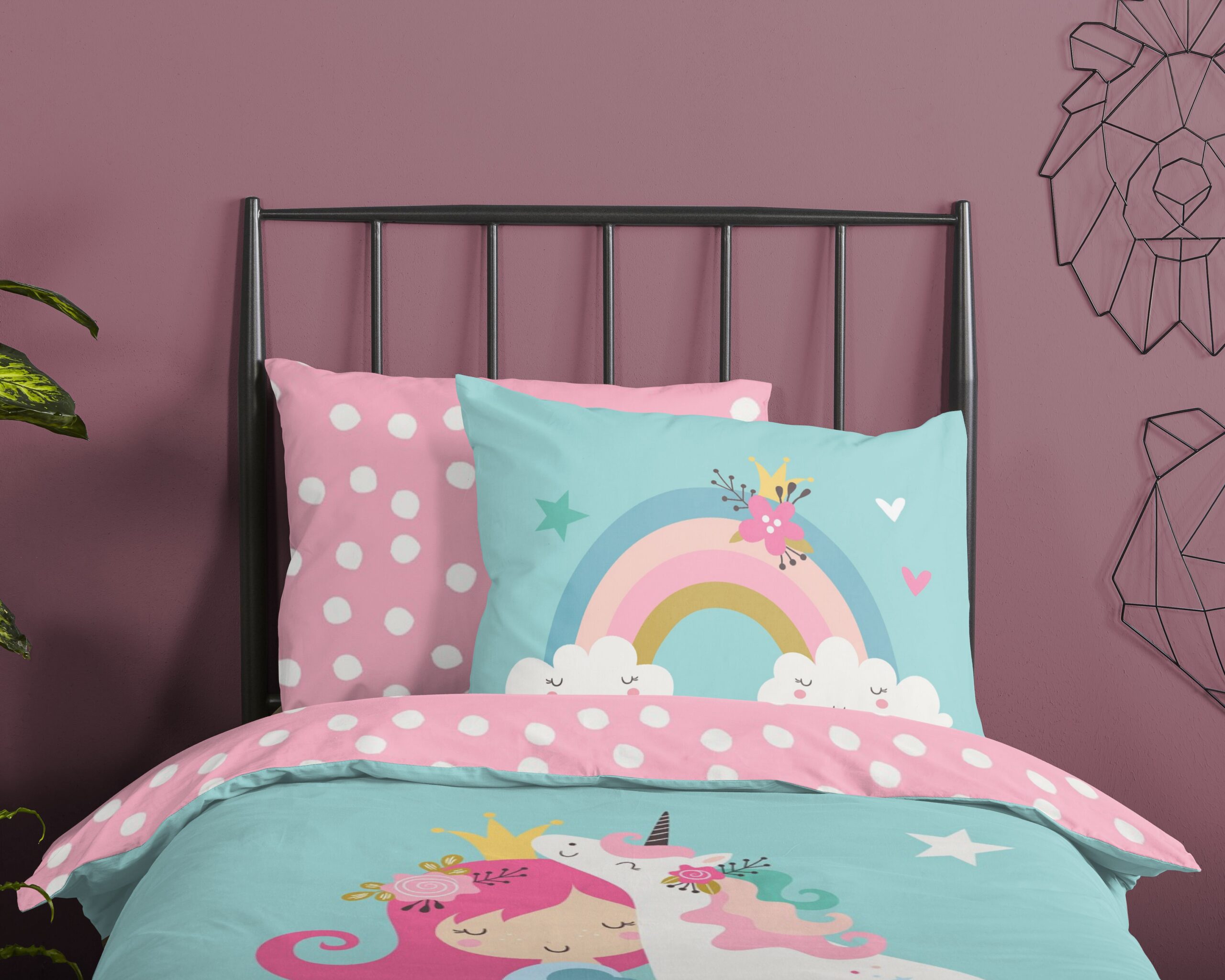 Kinderdekbedovertrek “Heaven” van Good Morning met eenhoorn met regenboog, in de kleur “Multi” is gemaakt van 100% katoen. Deze kwaliteit is ademend, vochtabsorberend en voelt zacht en soepel aan. Dit leuke kinderdekbedovertrek is een toevoeging aan iedere kinderkamer en is geschikt voor ieder jaargetijde. Het katoenen dekbedovertrek is heerlijk koel in de zomer en geeft warmte in de winter.