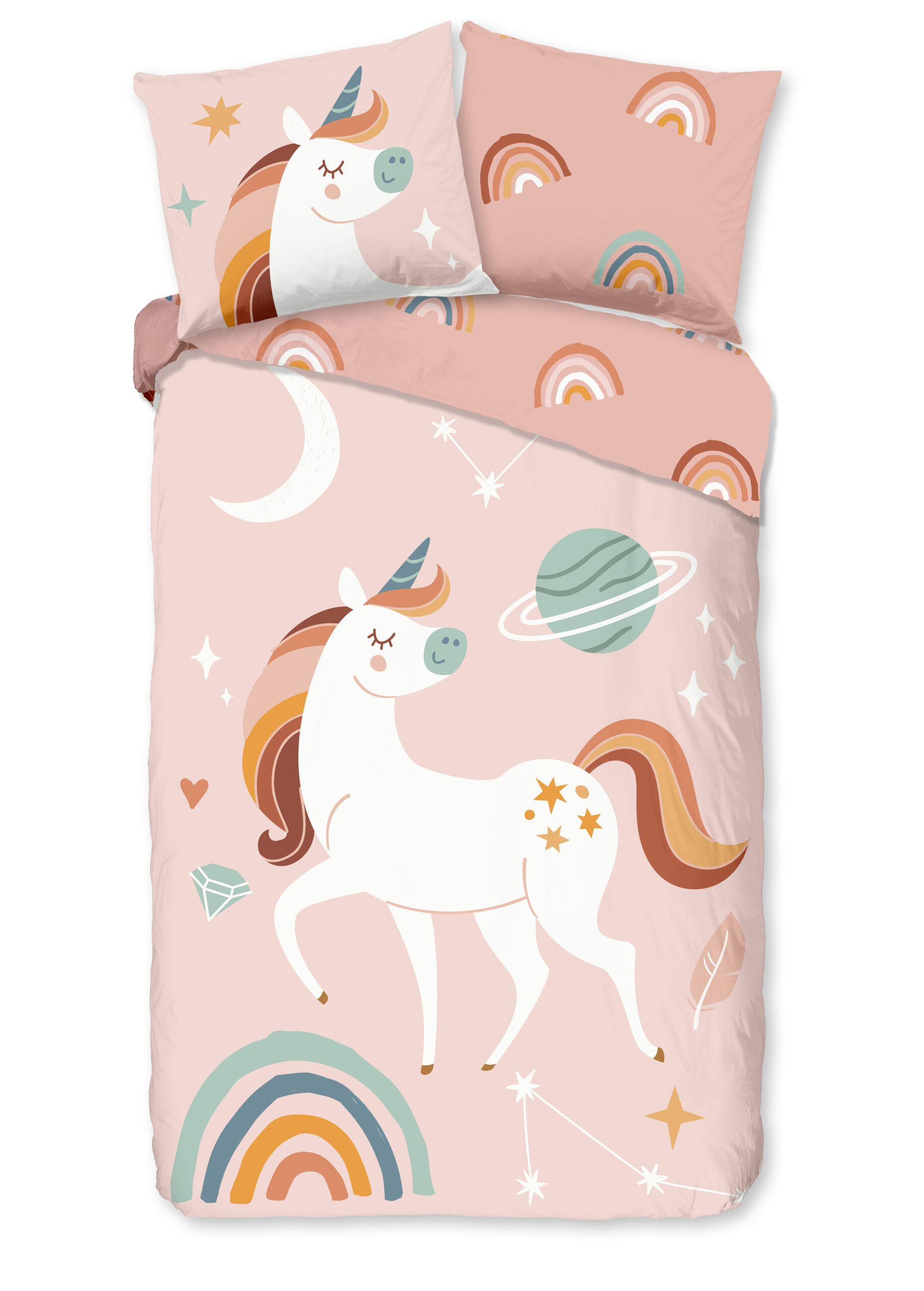 Good Morning Kinderdekbedovertrek “eenhoorn, planeten en regenboog” – Roze – (140×200/220 cm) – Katoen Flanel