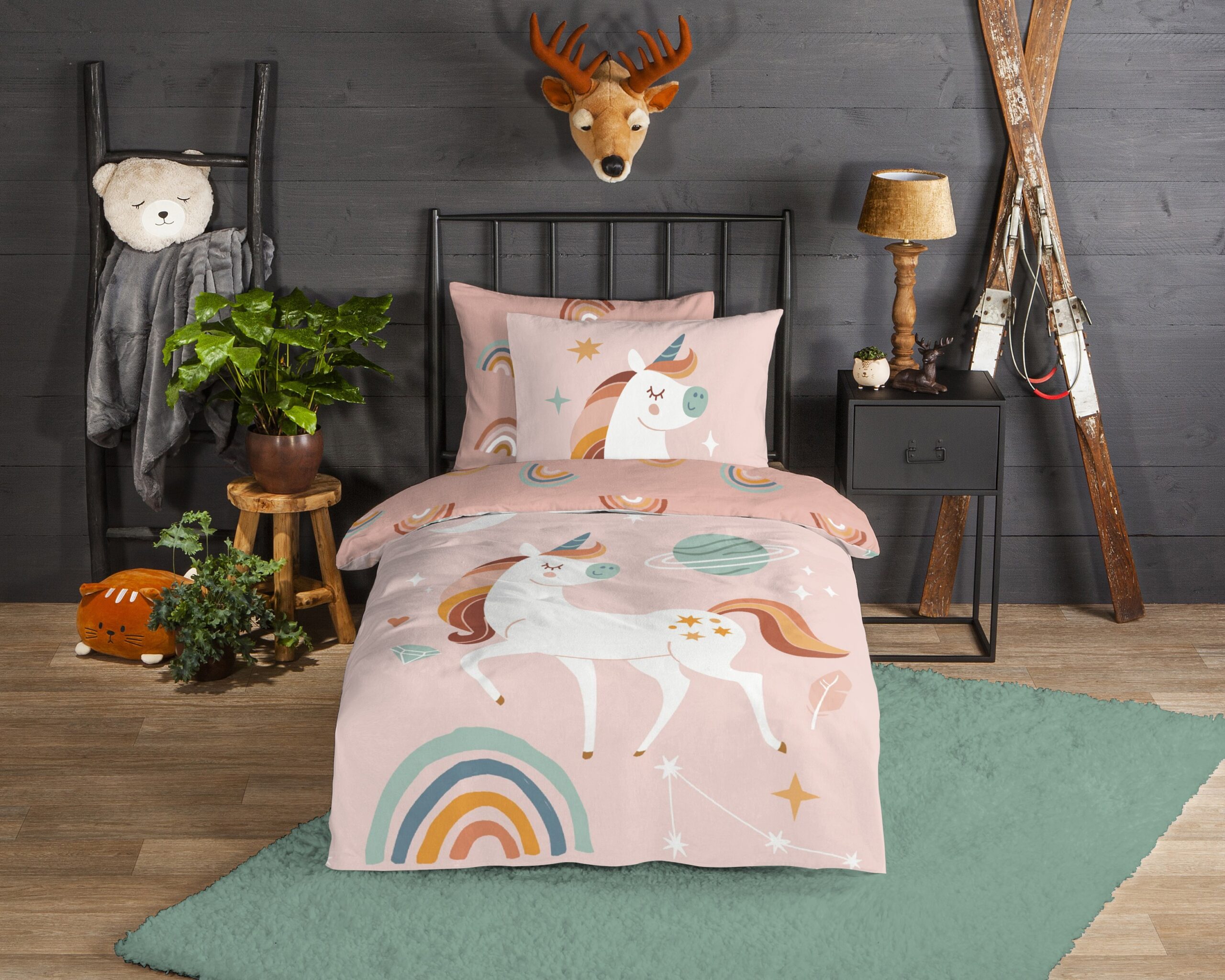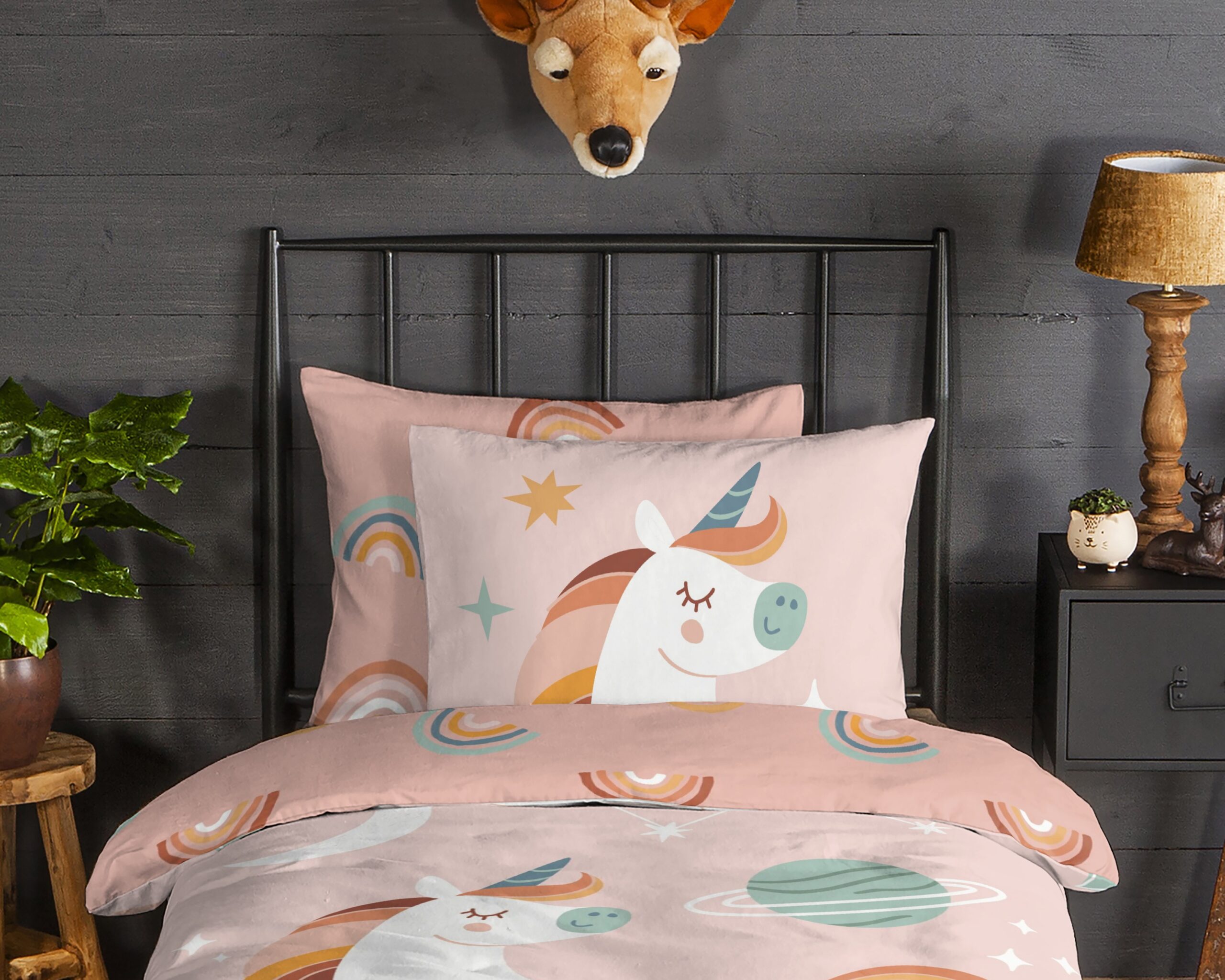 Flanellen Kinderdekbedovertrek “Unidance” van Good Morning met eenhoorn, planeten en regenboog, in de kleur “Roze” is gemaakt van 100% geruwde 100% katoen/flanel. Doordat het katoen licht opgeruwd is, ontstaat er een zacht laagje. Deze warme, zachte stof is ademend en vochtabsorberend. Dit leuke kinderdekbedovertrek is een toevoeging aan iedere kinderkamer en is uitermate geschikt voor de koude wintermaanden.