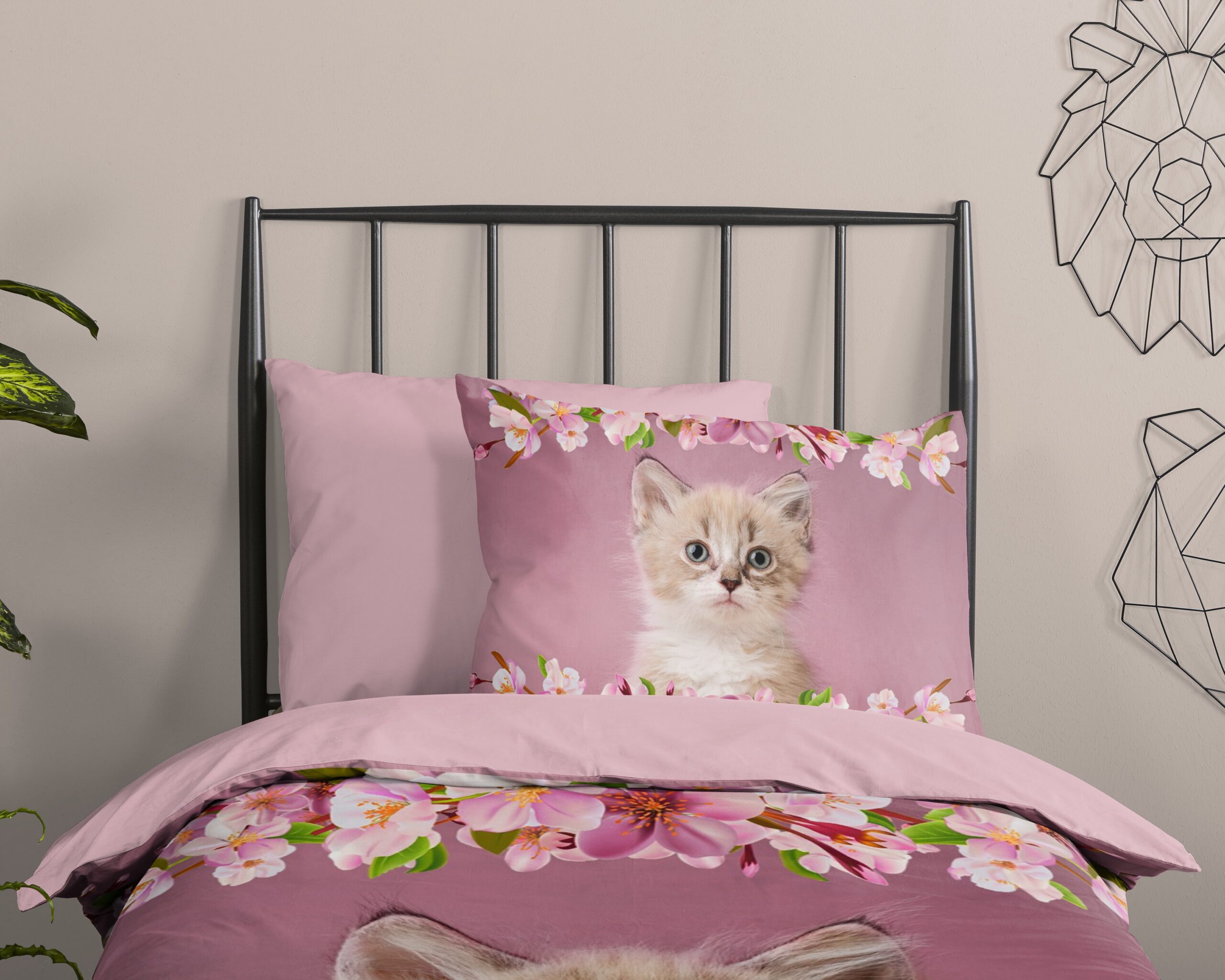 Kinderdekbedovertrek “Look” van Good Morning met kitten poes met bloemen, in de kleur “Roze” is gemaakt van 100% katoen. Deze kwaliteit is ademend, vochtabsorberend en voelt zacht en soepel aan. Dit leuke kinderdekbedovertrek is een toevoeging aan iedere kinderkamer en is geschikt voor ieder jaargetijde. Het katoenen dekbedovertrek is heerlijk koel in de zomer en geeft warmte in de winter.