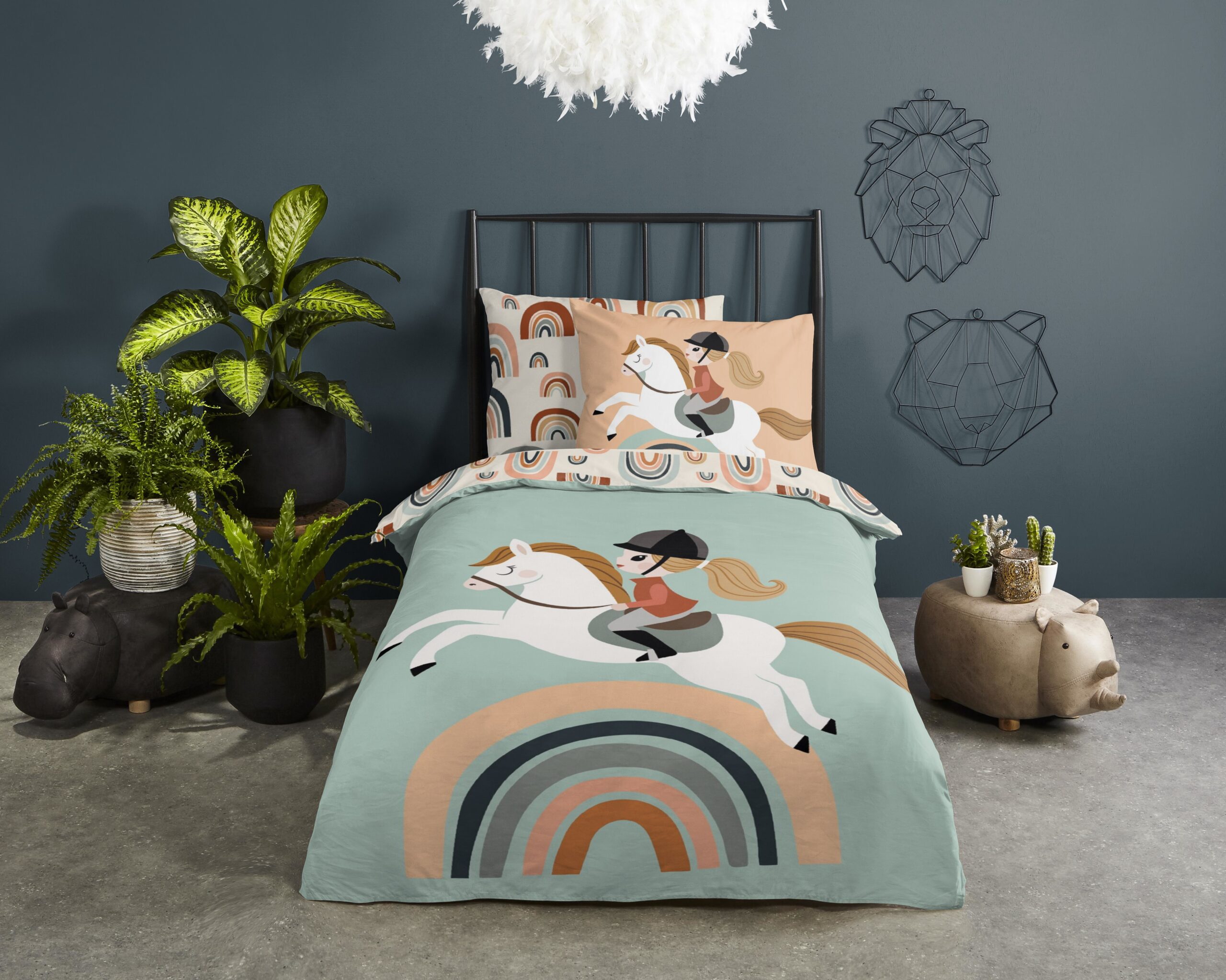 Kinderdekbedovertrek “Destin” van Good Morning met paard en regenboog, in de kleur “Multi” is gemaakt van 100% katoen. Deze kwaliteit is ademend, vochtabsorberend en voelt zacht en soepel aan. Dit leuke kinderdekbedovertrek is een toevoeging aan iedere kinderkamer en is geschikt voor ieder jaargetijde. Het katoenen dekbedovertrek is heerlijk koel in de zomer en geeft warmte in de winter.