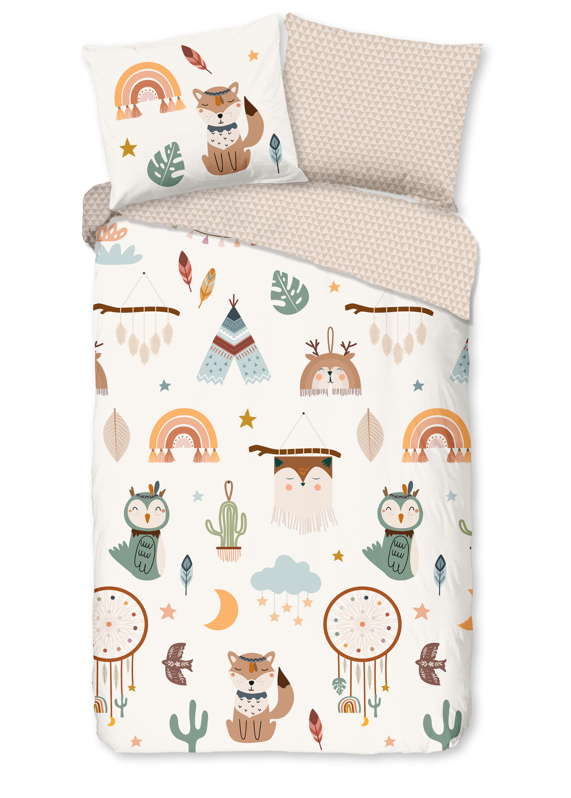 Kinderdekbedovertrek “Remi” van Good Morning met tipi-tenten / boho, in de kleur “Zand” is gemaakt van 100% katoen. Deze kwaliteit is ademend, vochtabsorberend en voelt zacht en soepel aan. Dit leuke kinderdekbedovertrek is een toevoeging aan iedere kinderkamer en is geschikt voor ieder jaargetijde. Het katoenen dekbedovertrek is heerlijk koel in de zomer en geeft warmte in de winter.