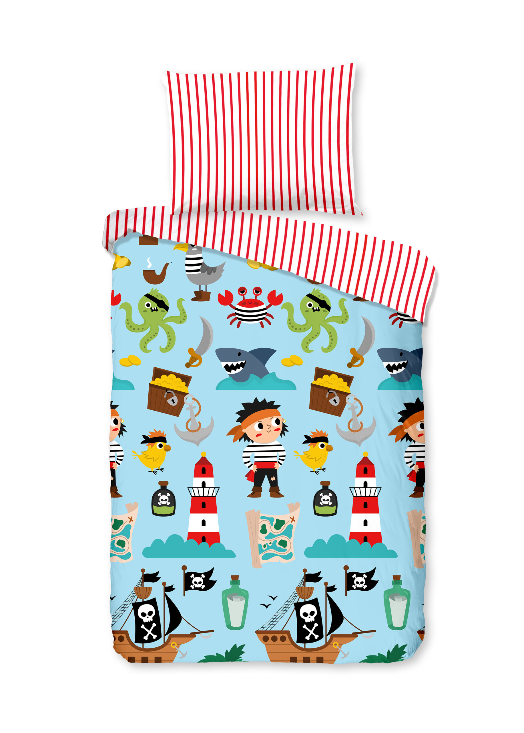 Peuter dekbedovertrek “Caribbean” van Good Morning met piraten/ zee thema, in de kleur “Multi” is gemaakt van 100% katoen. Deze kwaliteit is ademend, vochtabsorberend en voelt zacht en soepel aan. Dit leuke peuter dekbedovertrek is een toevoeging aan iedere peuter/ kinderkamer! Het peuter dekbedovertrek is geschikt voor ieder jaargetijde. Het katoenen dekbedovertrek is heerlijk koel in de zomer en geeft warmte in de winter.
