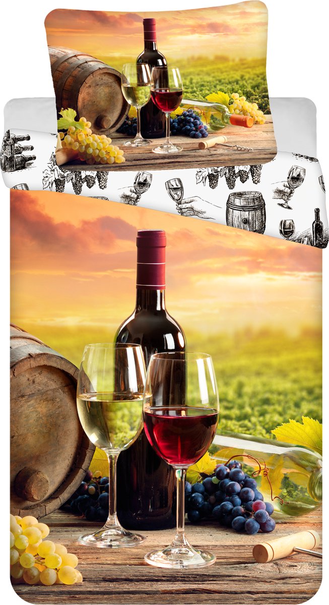 Wijn dekbedovertrek is een dekbedovertrek met afbeelding van een wijngaard. Het beddengoed is gemaakt van 100% katoen. De kussensloop en het dekbedovertrek hebben een ritssluiting. Het dekbedovertrek is dubbelzijdig te gebruiken, dus wil je een keer een andere print, dan draai je hem gewoon even om