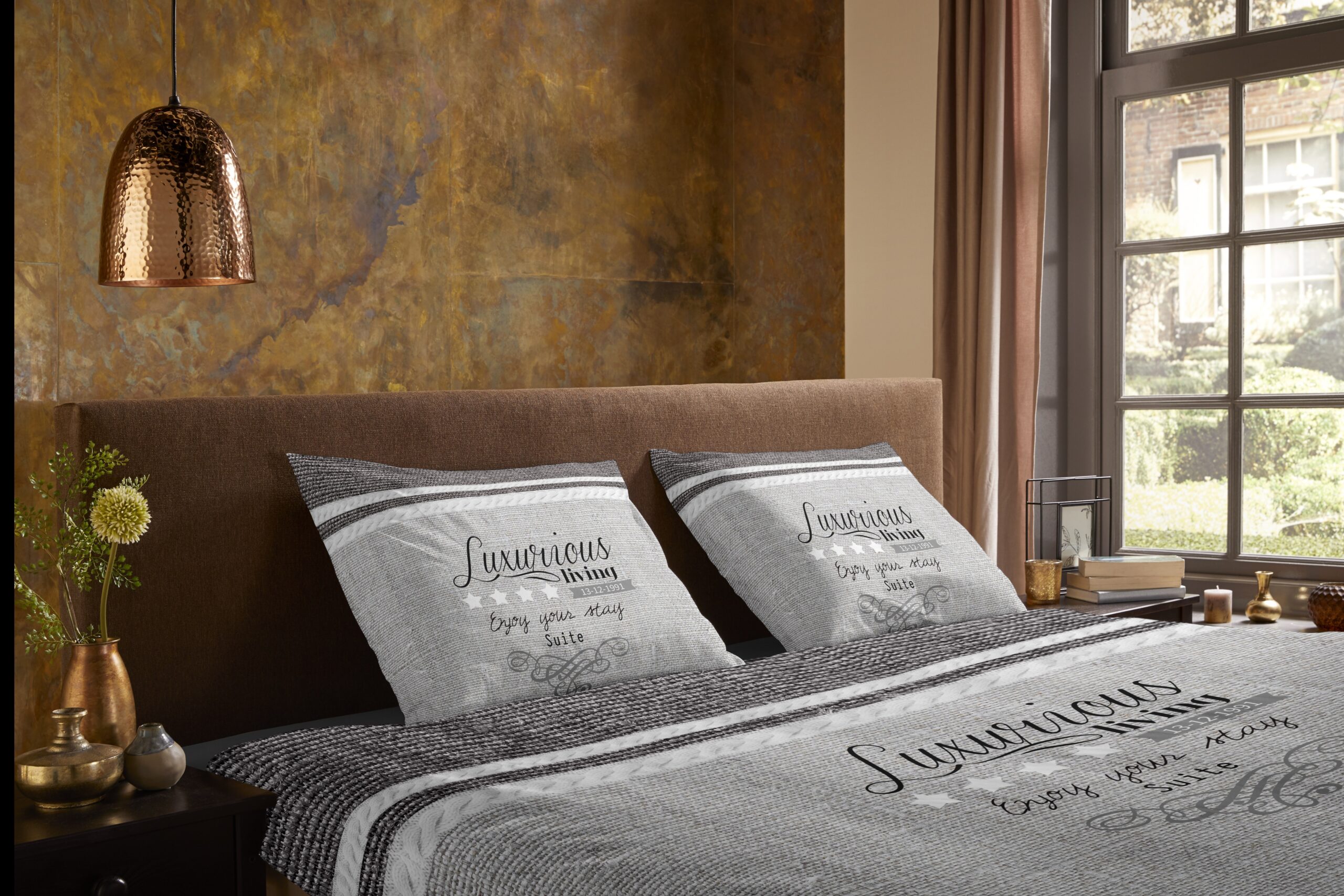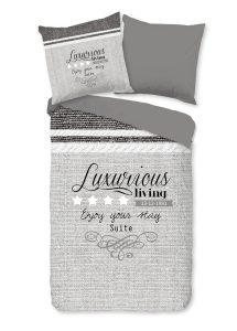 Dekbedovertrek “Suite” van Pure met tekst, in de kleur “Grijs” is gemaakt van 100% polyester/microfiber. Het is een prettige stof, dat soepel om je heen valt en ook nog eens licht van gewicht is. Het is geschikt voor ieder jaargetijde en door de lichte glans heeft het een luxe uitstraling. Na het wassen is deze stof snel droog en kreukt niet tot nauwelijks waardoor strijken (vrijwel) niet nodig is.