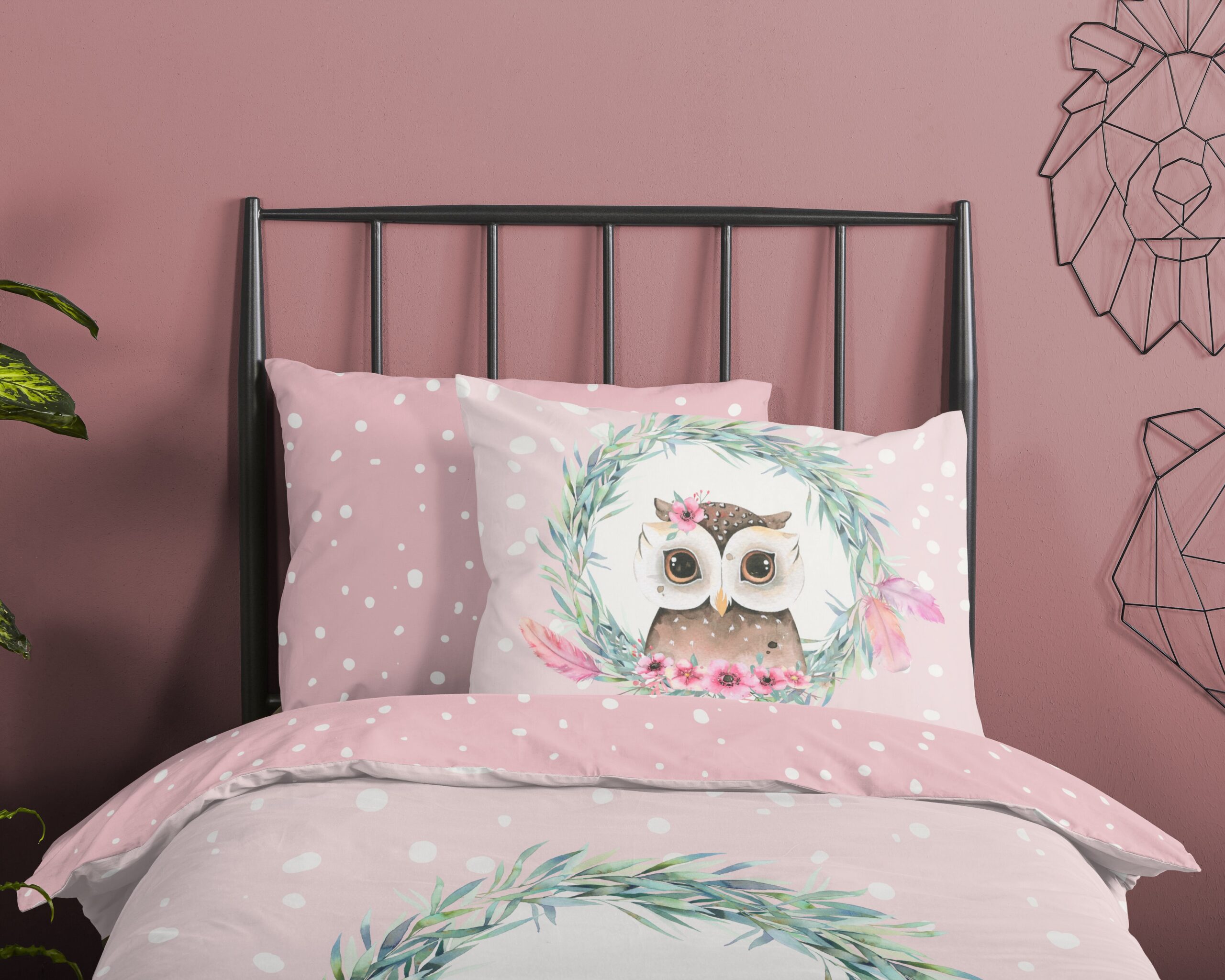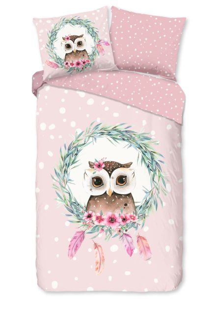 Good Morning Kinderdekbedovertrek “uil en veren” – Roze – (140×200/220 cm) – Katoen