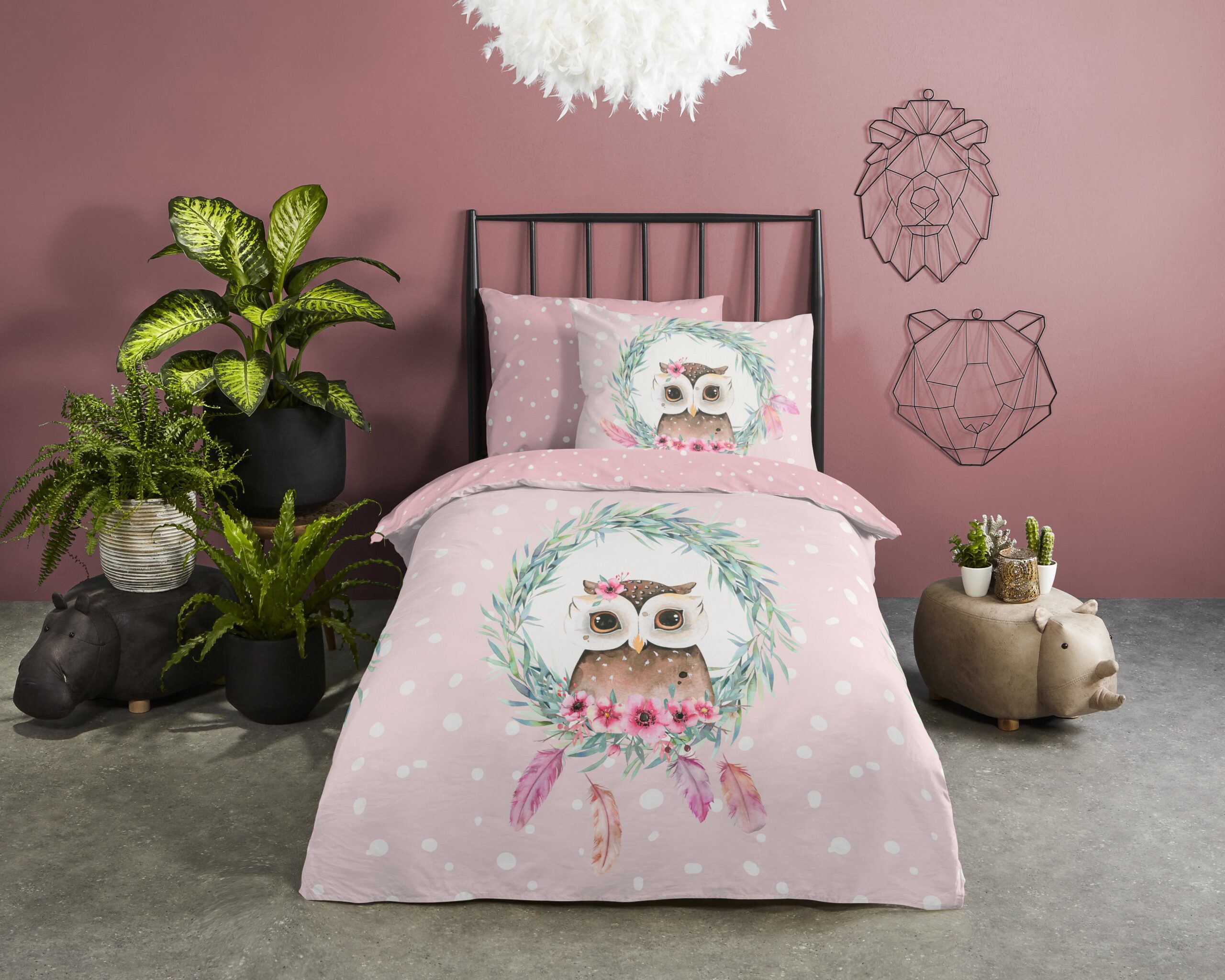 Good Morning Kinderdekbedovertrek "uil en veren" - Roze - (140x200/220 cm) - Katoen